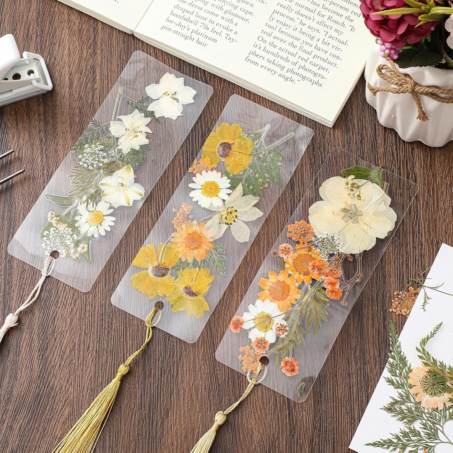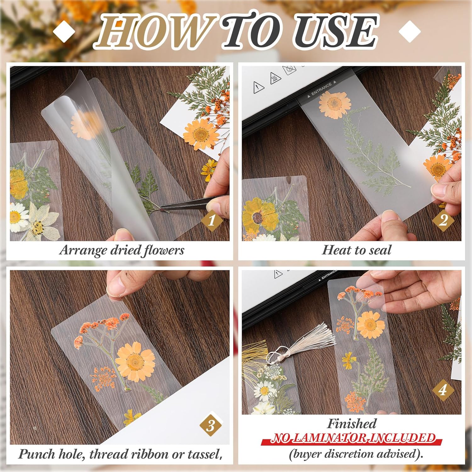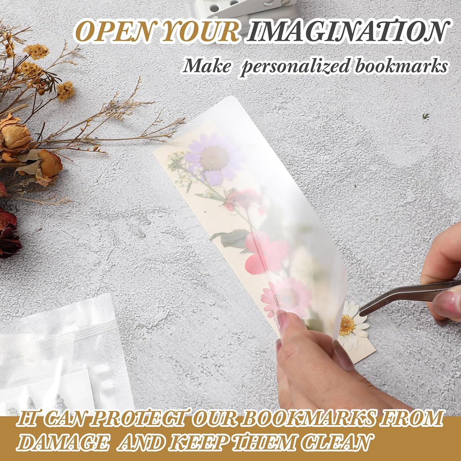 Creating your own Bookmarks: give a personal touch to your reading habit with the bookmark laminating pouch; This kit includes 150 sheets of 5 mil laminating pouches measuring about 2 x 6 inches/ 6 x 16 cm, 150 bookmark tassels, 75 dried flower and a white puncher, helping you create your own bookmark
