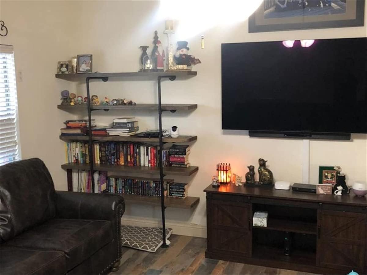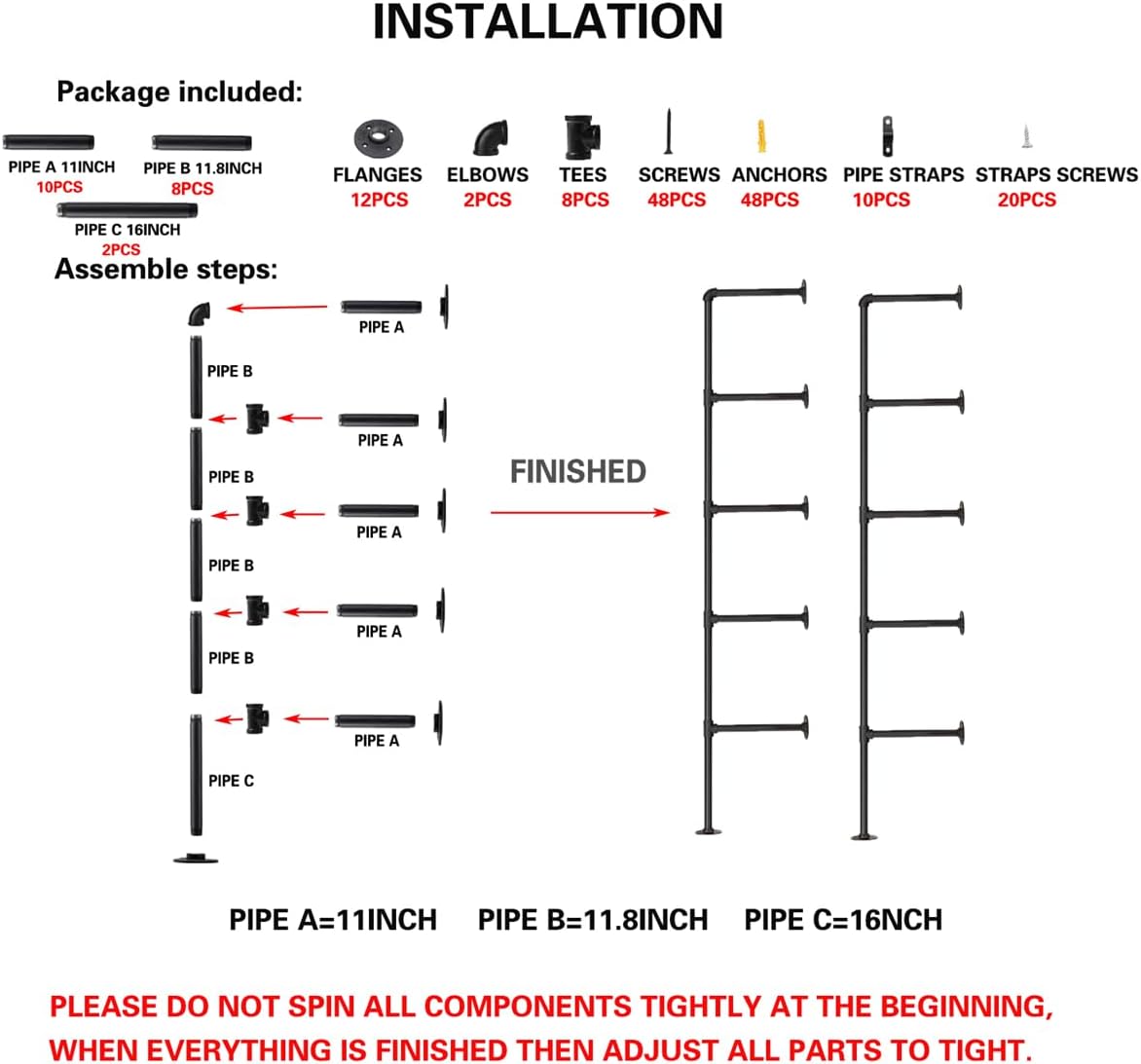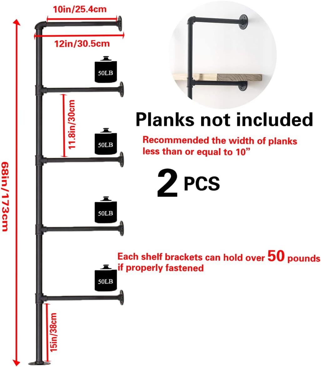 【Dimensions】68″ high, 5 Tier, about 10.8″ between each tier (excluding tees, elbows); depth 10″(without screw position); 3/4″ pipe diameter; 12 Flanges, 2 elbows, 8 tees,Recommended the width of board is less than or equal to 10″.