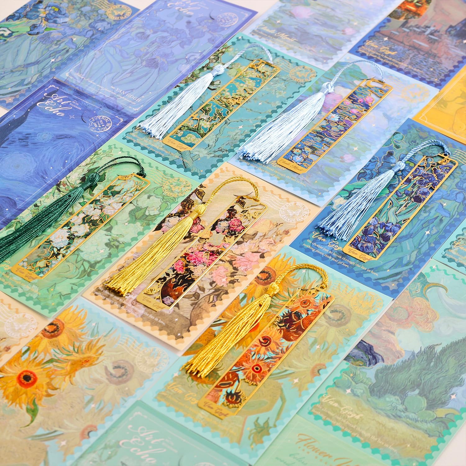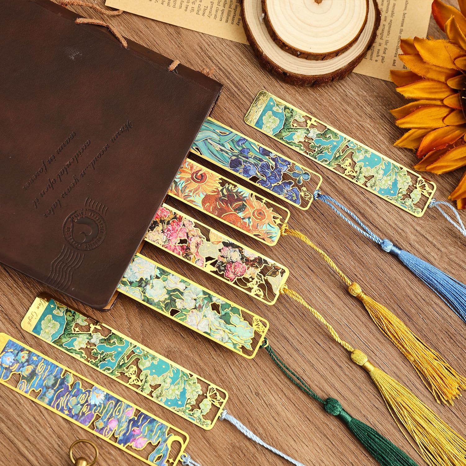 6 Pieces Metal Bookmarks with Tassel, Golden Hollow Bookmark Oil Painting Theme Book Mark Bookmarks for Book Lovers Writers Readers Children Teens Men Women Adults