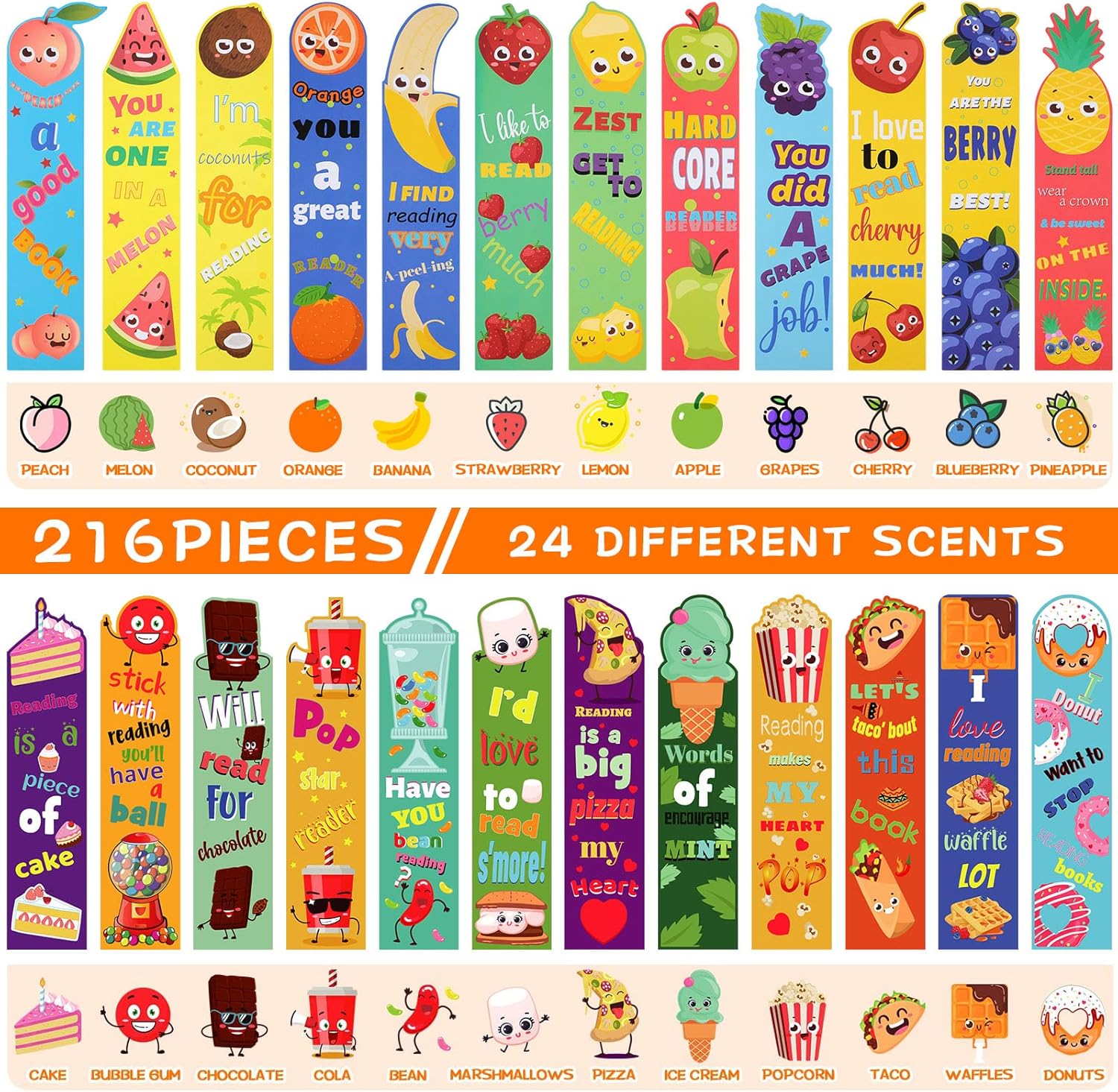 Ample Quantity: the package comes with a total of 216 pieces of fruit scented candy bookmarks in 24 different styles, 9 pieces per style, ample quantities can meet your daily reading needs and replacements, and you can also share them with your friends