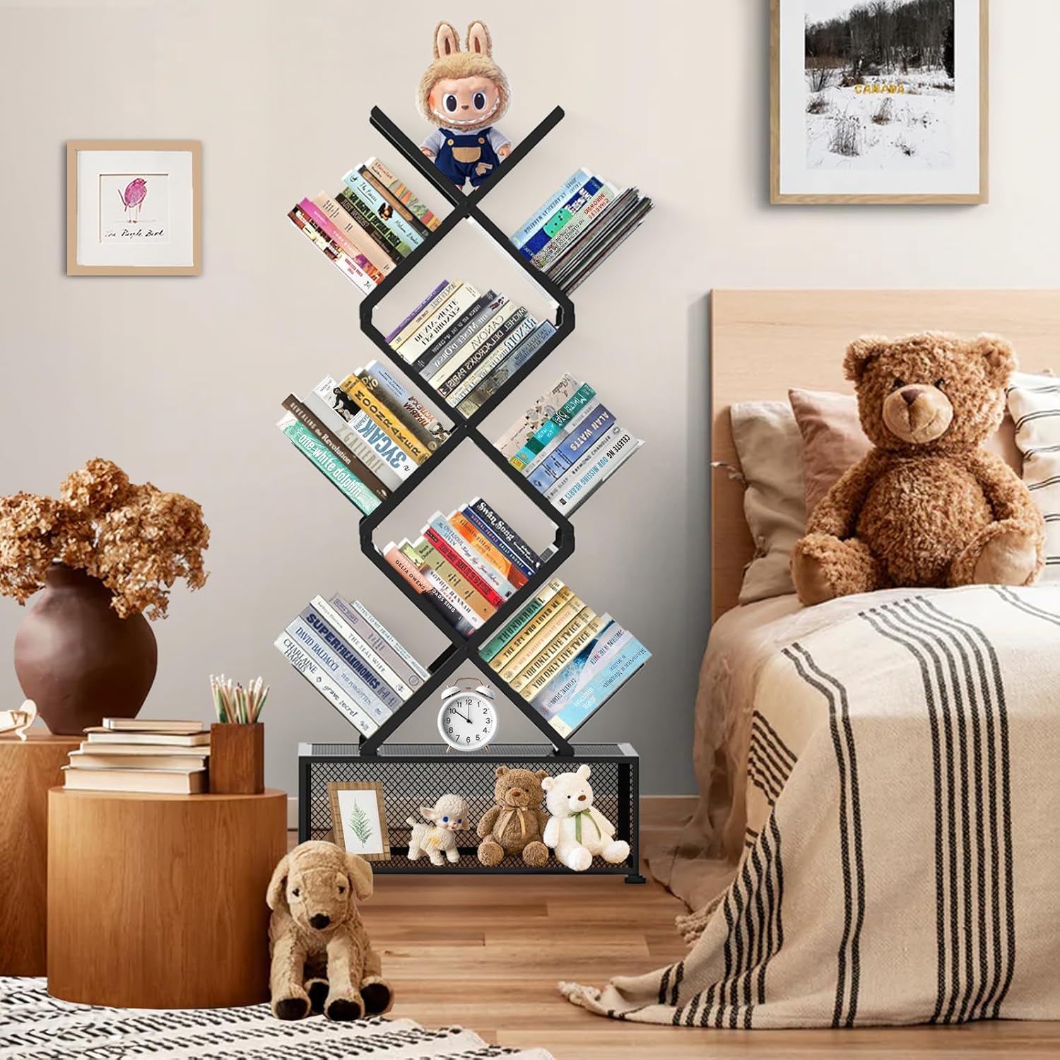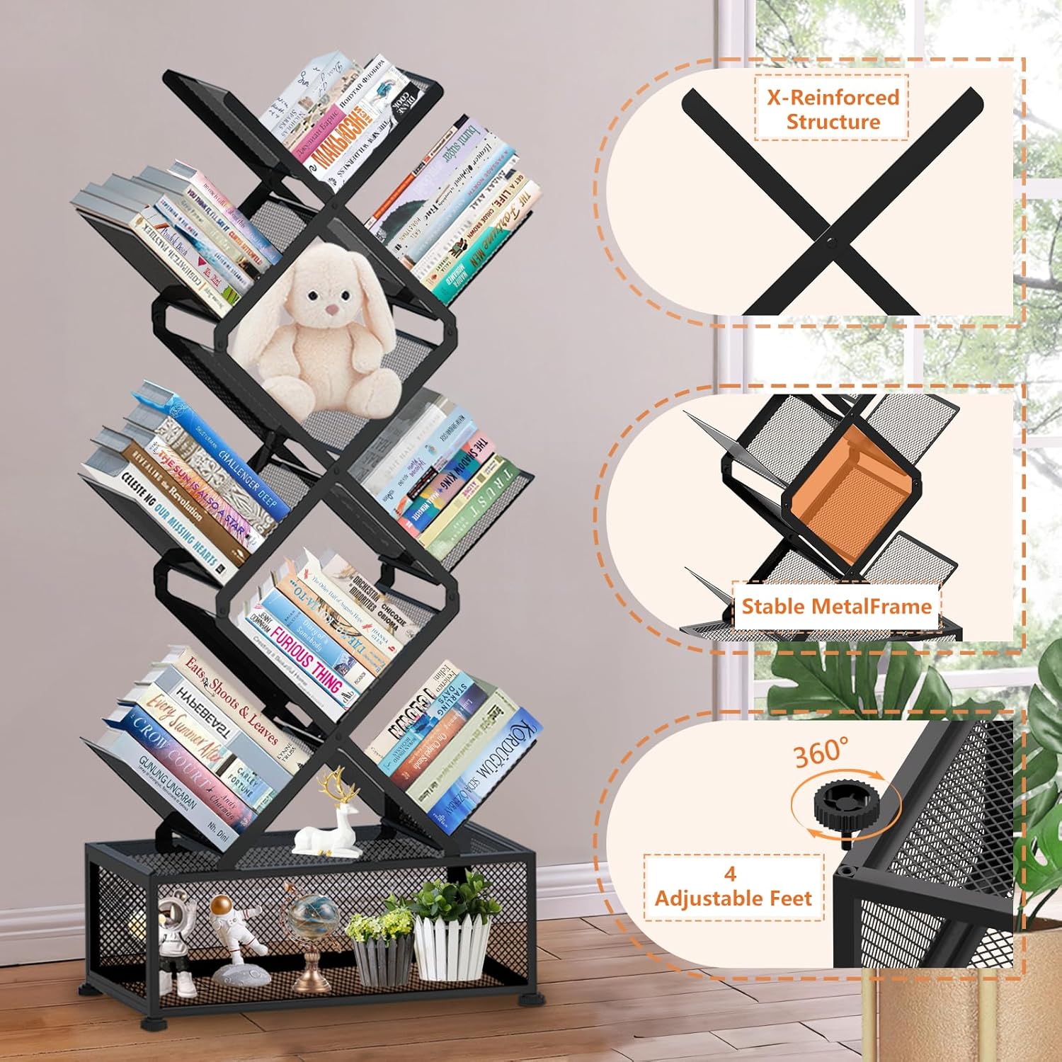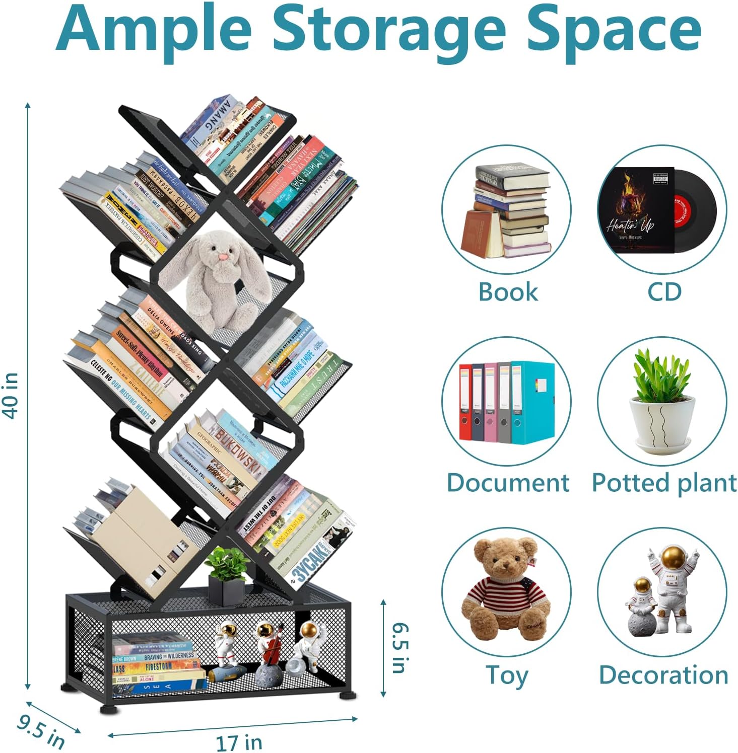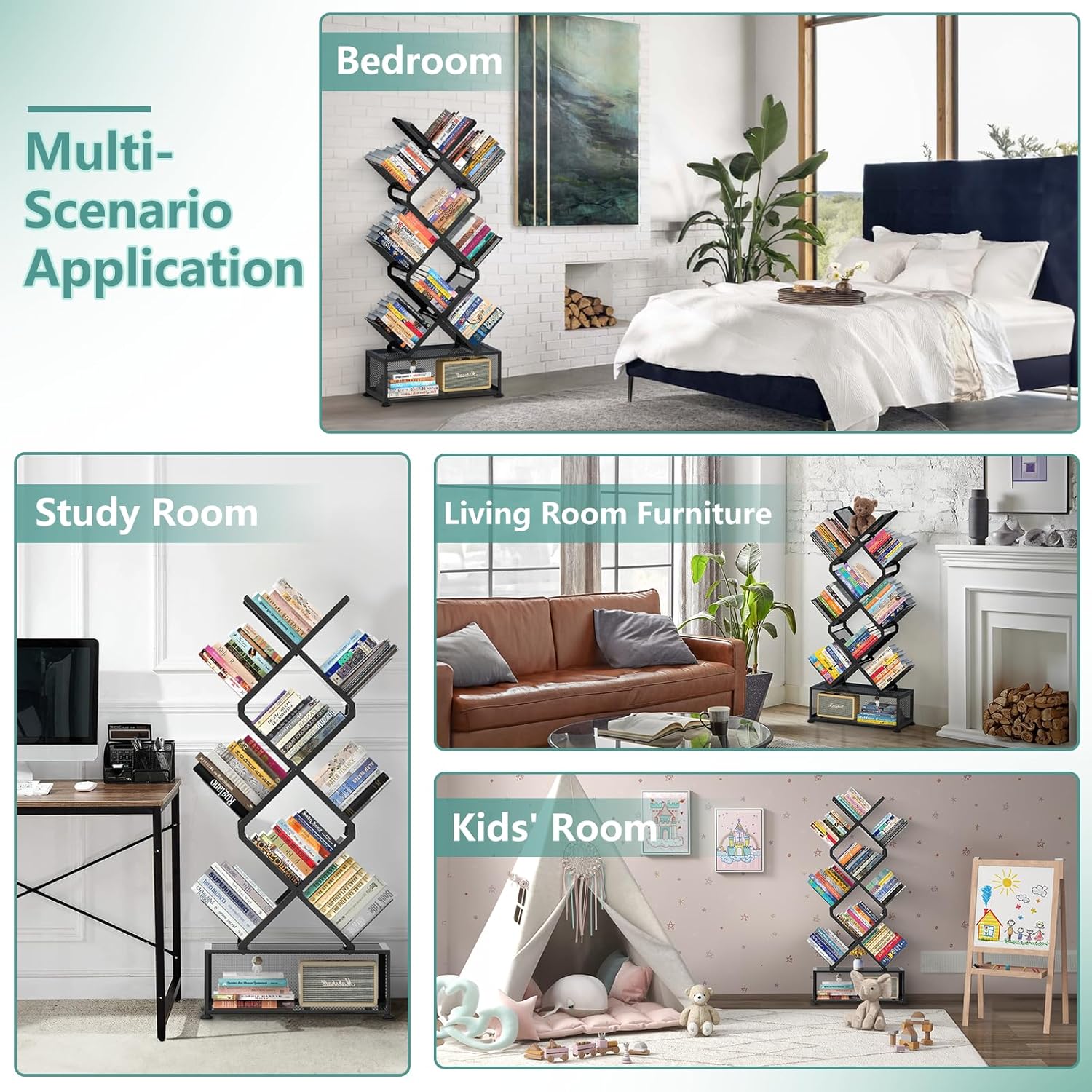 【Stable Structure & Durable】The bookshelf is designed to be unfolded on both sides and does not need to be equipped with an anti-tipping device or fixed to the wall.no matter where the book tree bookshelf sits, it can stand safely without worrying about tipping over.Made of high quality metal materials, this bookshelves tower ensures enhanced load-bearing capacity, offering durability and stability for your storage needs.