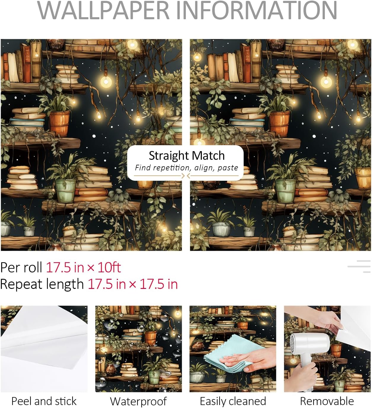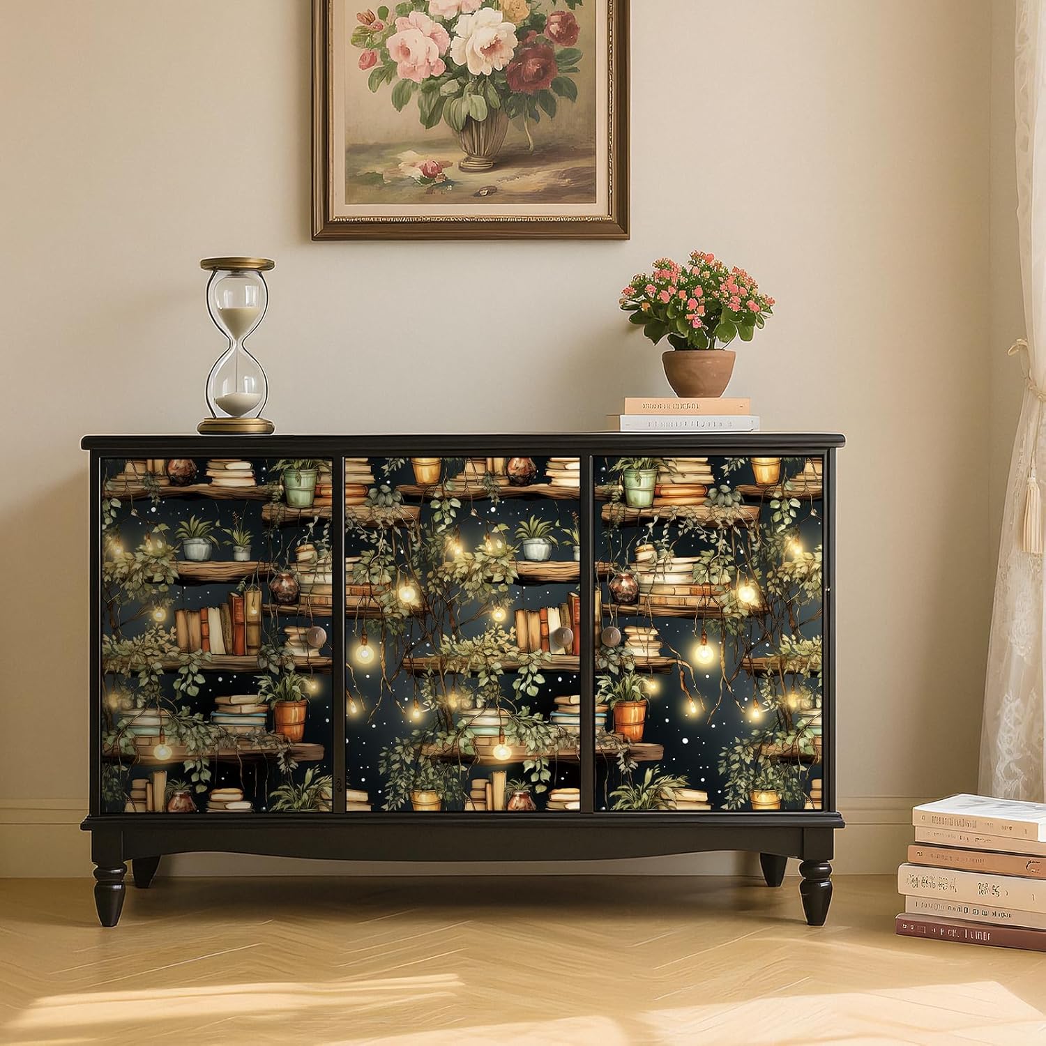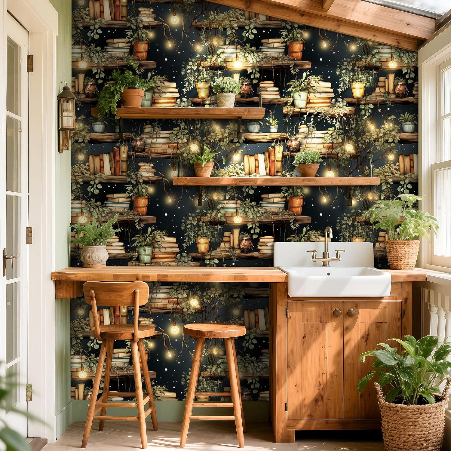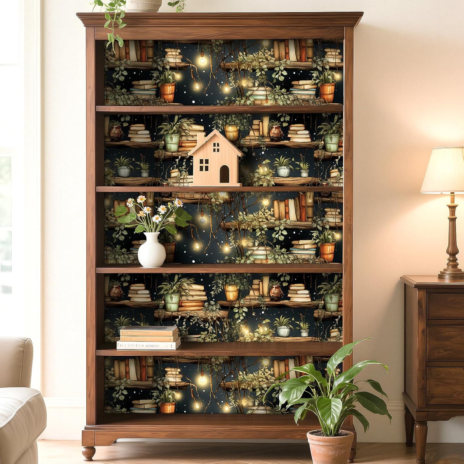 đżă Boho Bookshelf Wall Decoră â Size: 17.5in x 23ft (33.5 sq.ft), designed for dreamers, creators, and book lovers, this book wallpaper brings warm tones, greenery, and fairy lights together in a way that adds instant charm to bedrooms, living rooms, cafes, classrooms, and home offices