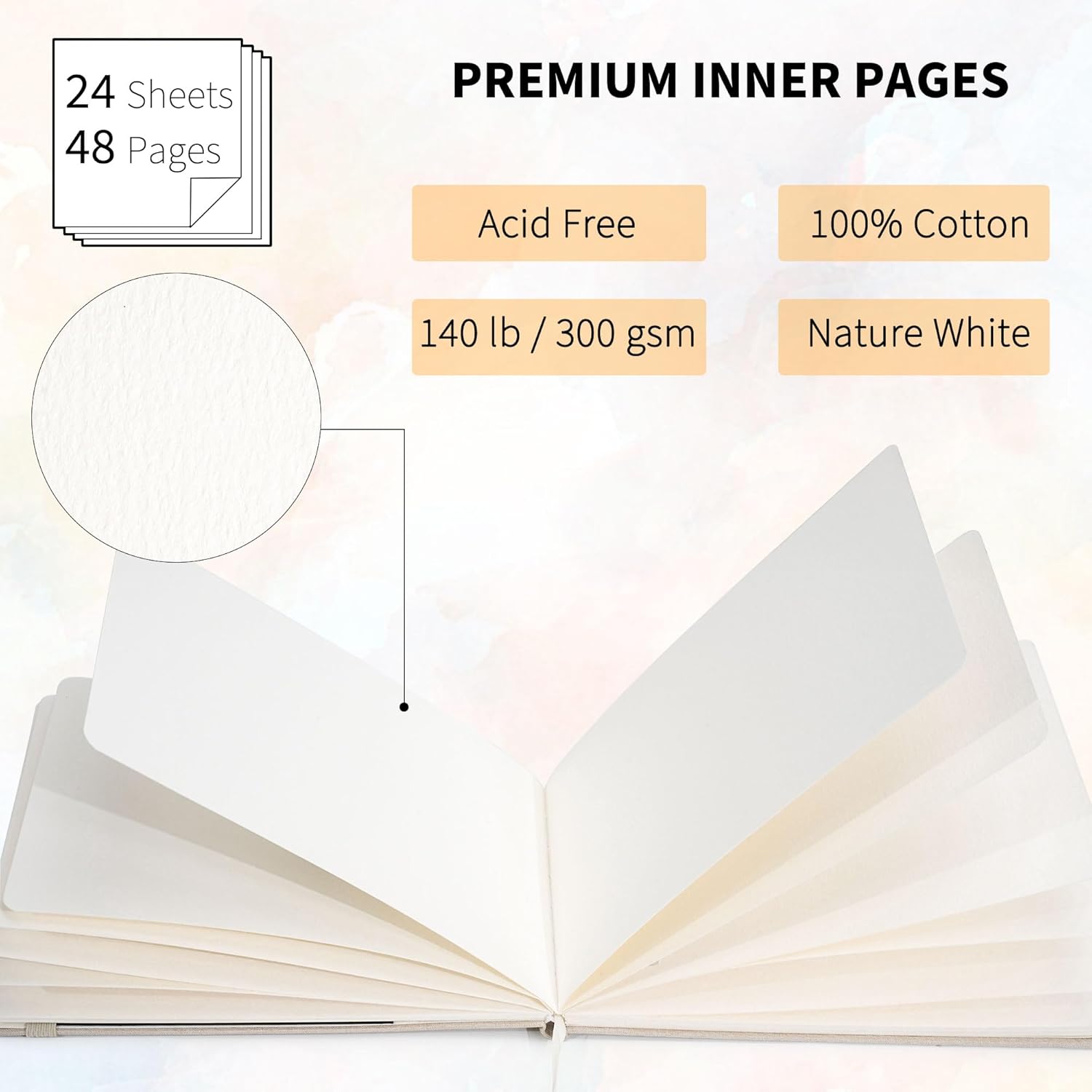 Premium 300GSM Cold Press Cotton Paper: Thick, non-bleeding paper suitable for watercolors, markers, gouache, oil pastels, and mixed media, ensuring vibrant colors without warping or seep-through