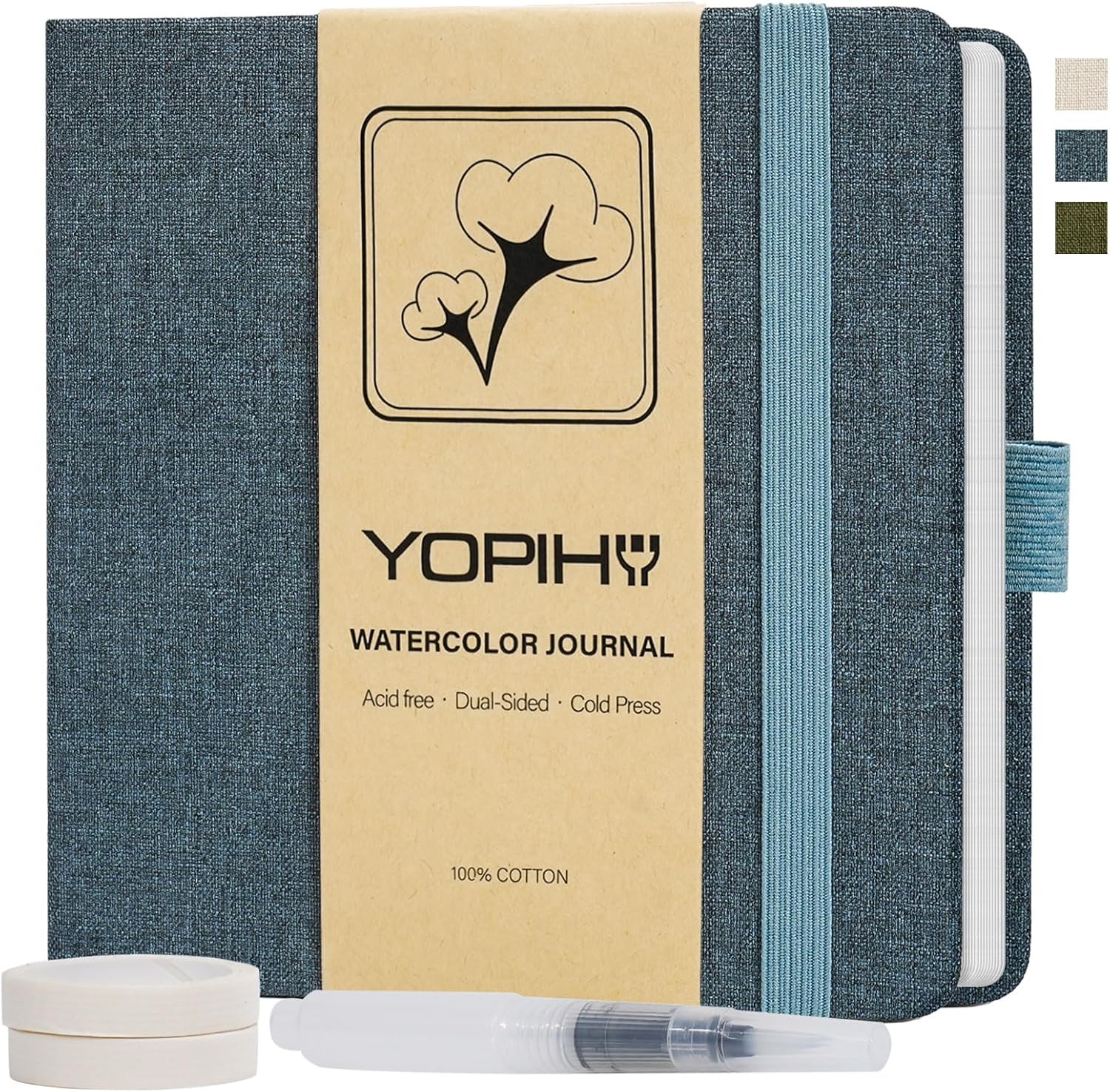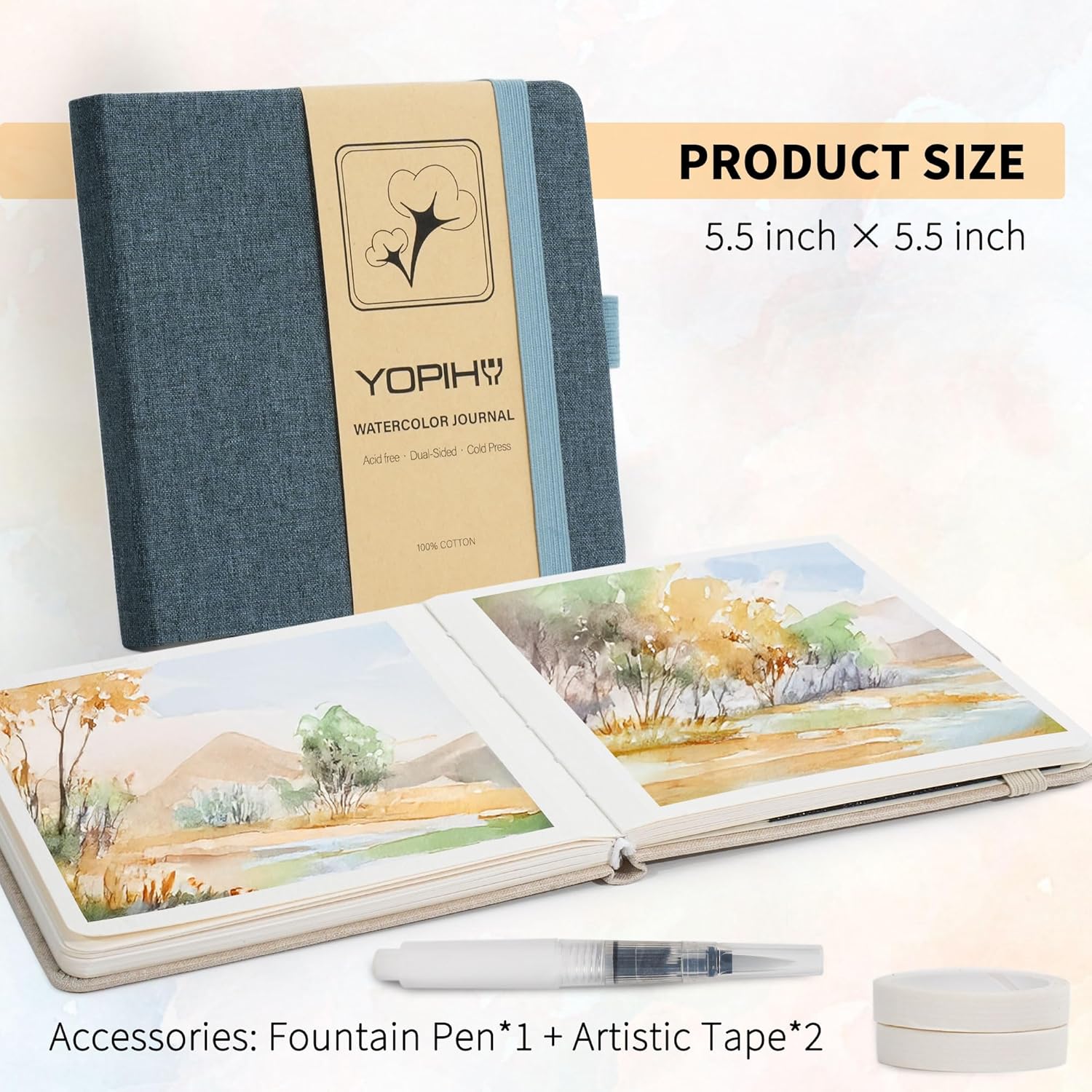 Yopih Artists Premium Linen Watercolor Sketchbook, 5.5″ x 5.5″ Watercolor Notebook with 300GSM Cold Press Cotton Paper, 24 Sheets/48 Pages, Ideal Art Journal for Markers, Oil Pastels, Navy