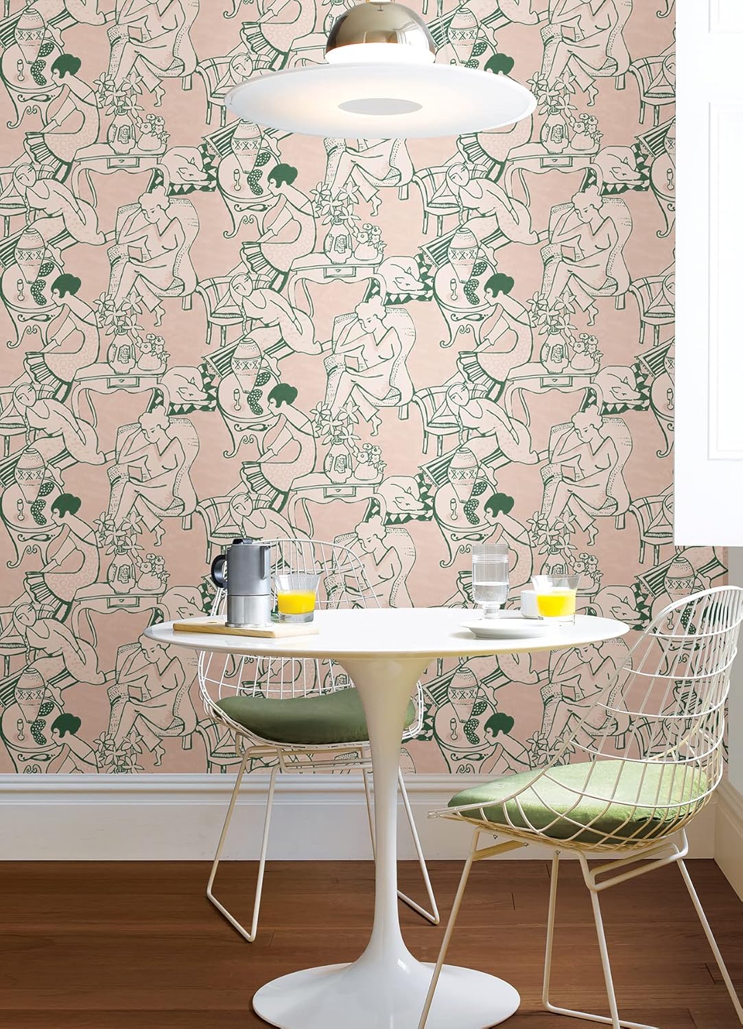 Pink and green peel and stick NuWallpaper featuring a group of ladies lounging at a parlor