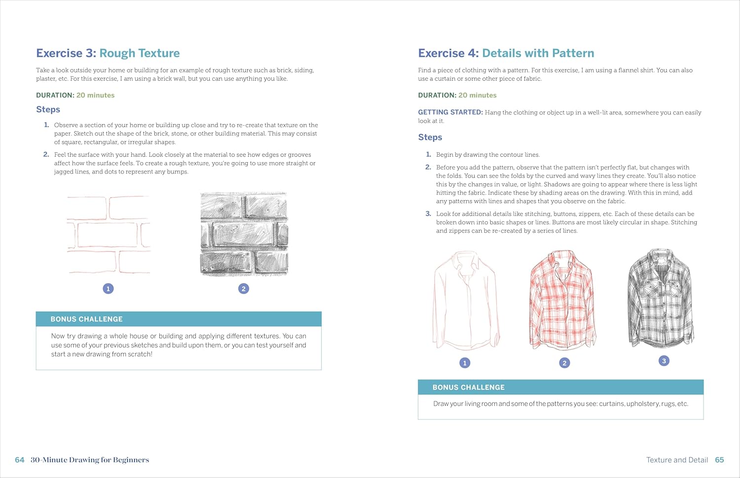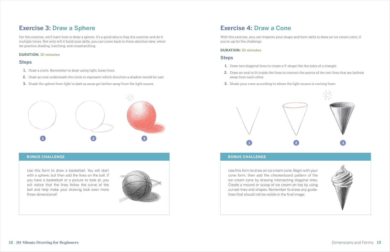 Easy-to-follow instructions―Build your abilities with illustrated, step-by-step directions designed to help you progress from sketching simple forms to detailed landscapes and self-portraits.Essential techniques―Learn the key elements you’ll need to improve your drawing, such as shape, texture, and form, and then practice what you’ve learned with bonus challenges.Lessons you’ll want to practice―With some exercises as short as 10 minutes, it’s easy to fit lessons from 30-Minute Drawing for Beginners into even the busiest schedule.