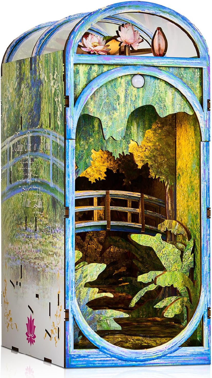 This miniature book nook kit combines a working wooden puzzle box with decorative craft, an artistic bookend and the fun of model kits for adults. Designed to accent any room, style or home library decor, this 3D puzzle will bring a touch of 19th century Provence, France to your space.