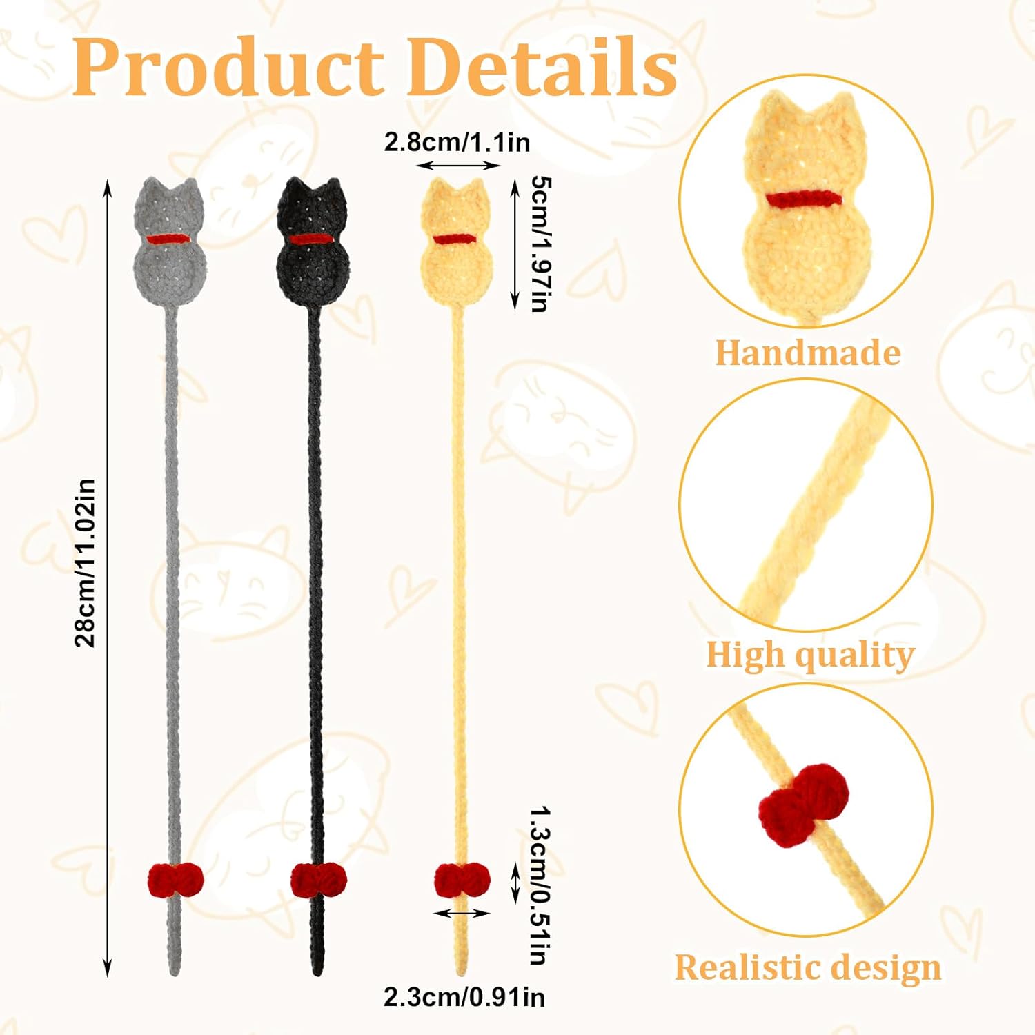 Suitable Size: The crochet bookmark is 28 cm (11.02 in) long. The cat is 5 cm (1.97 in) by 2.8 cm (1.1 in), and the bow is 2.3 cm (0.91 in) by 1.3 cm (0.51 in). It is hand-woven and elastic, so there may be slight variations in size. It is suitable for most books and magazines.