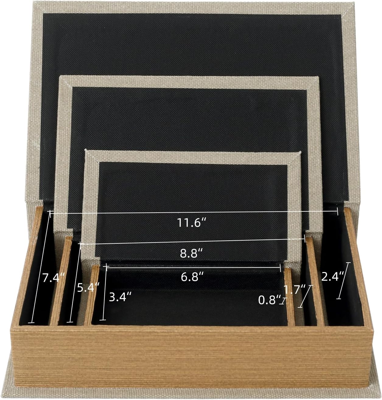 Set of 3 with Visual Hierarchy: The DECOR4SEASON Modern Book Box Set includes three boxes, each with a different size, creating a visually appealing layered effect. The dimensions of the boxes are as follows: 13″ L x 8.66″ W x 2.75″ H, 10.23″ L x 6.7″ W x 1.96″ H, and 8.26″ L x 4.72″ W x 1.18″ H.