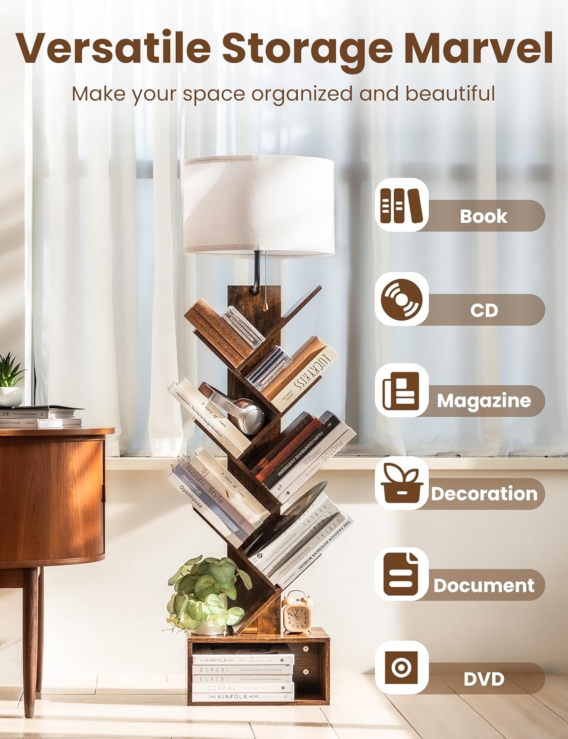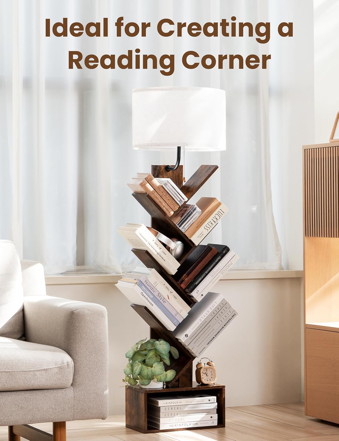 6 Tier Tree Bookshelf with Light, Corner Tall Narrow Bookshelf, Small Bookcase with Storage Cabinet,Floor Standing Bookshelves Organizer for Bedroom/Living Room/Home Office, Rustic Brown