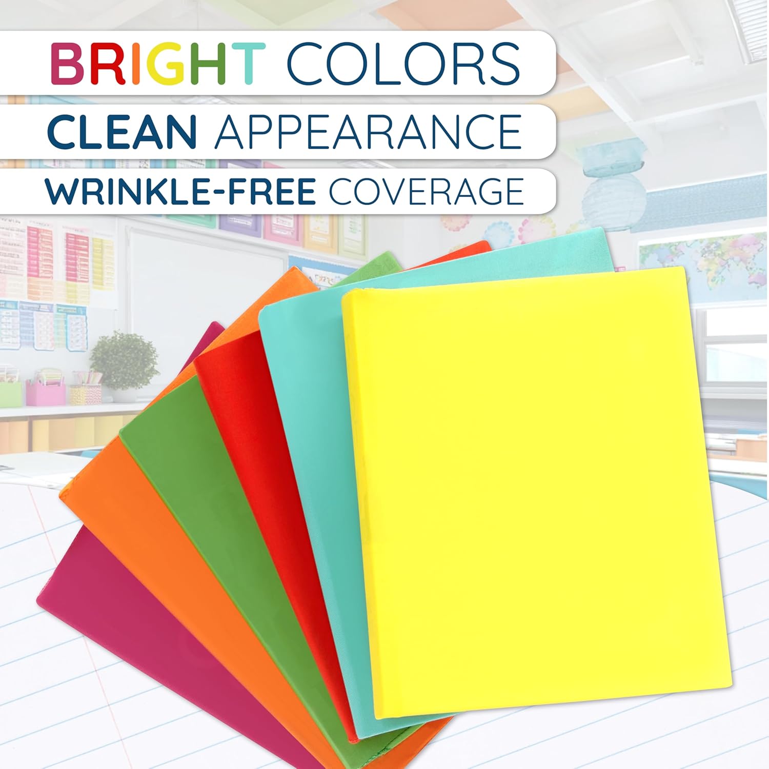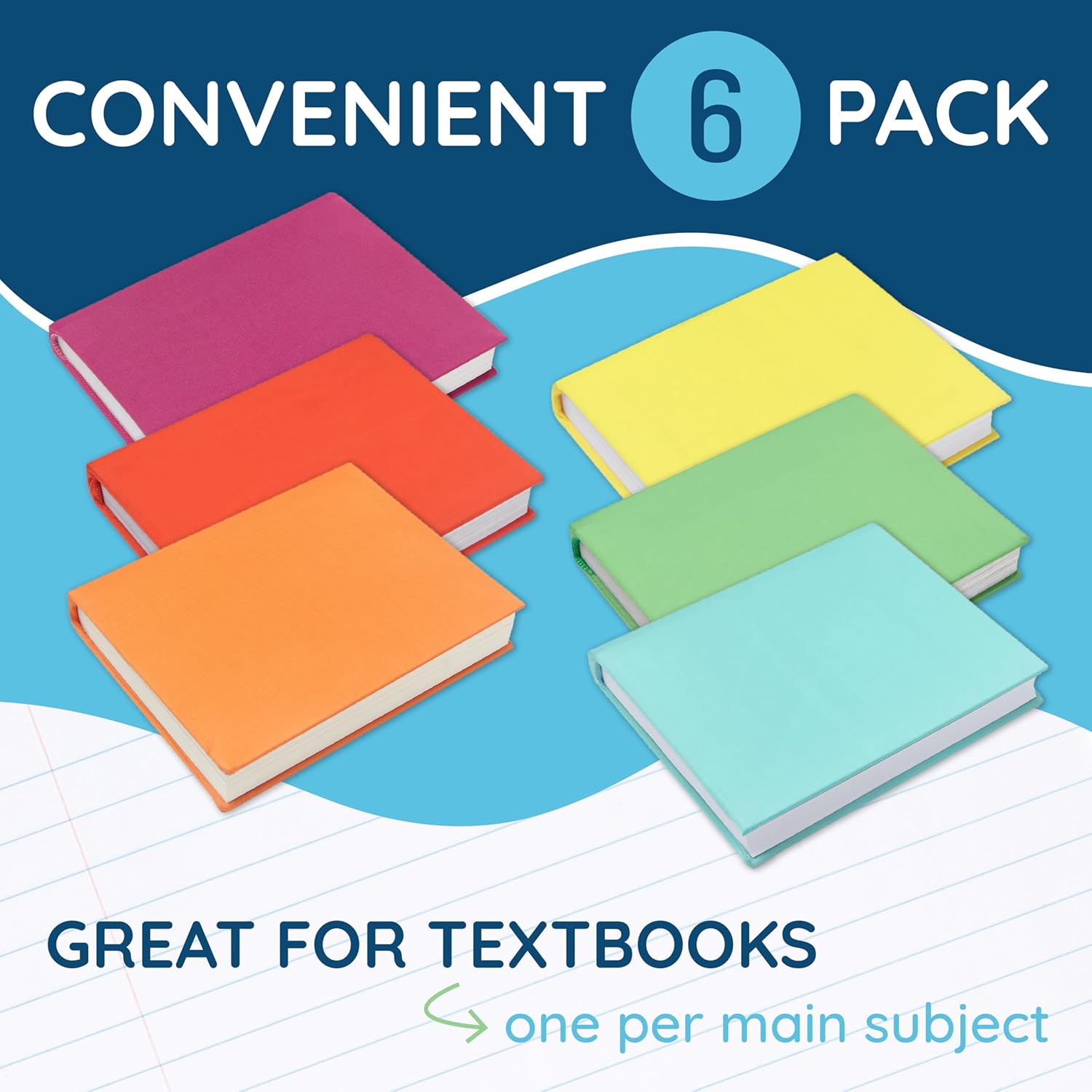 This pack comes with 6 stretchable book covers in purple, blue, green, yellow, red, and orange that durable and bright. Great for keeping every text book safe, all year long.