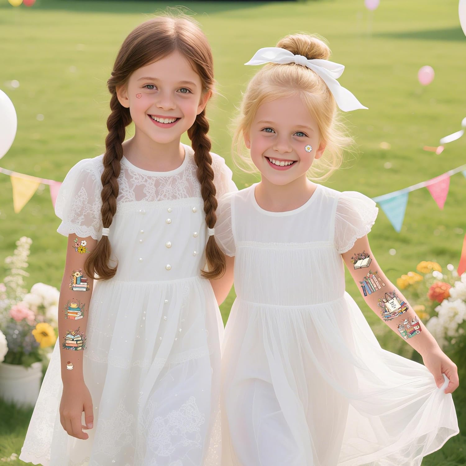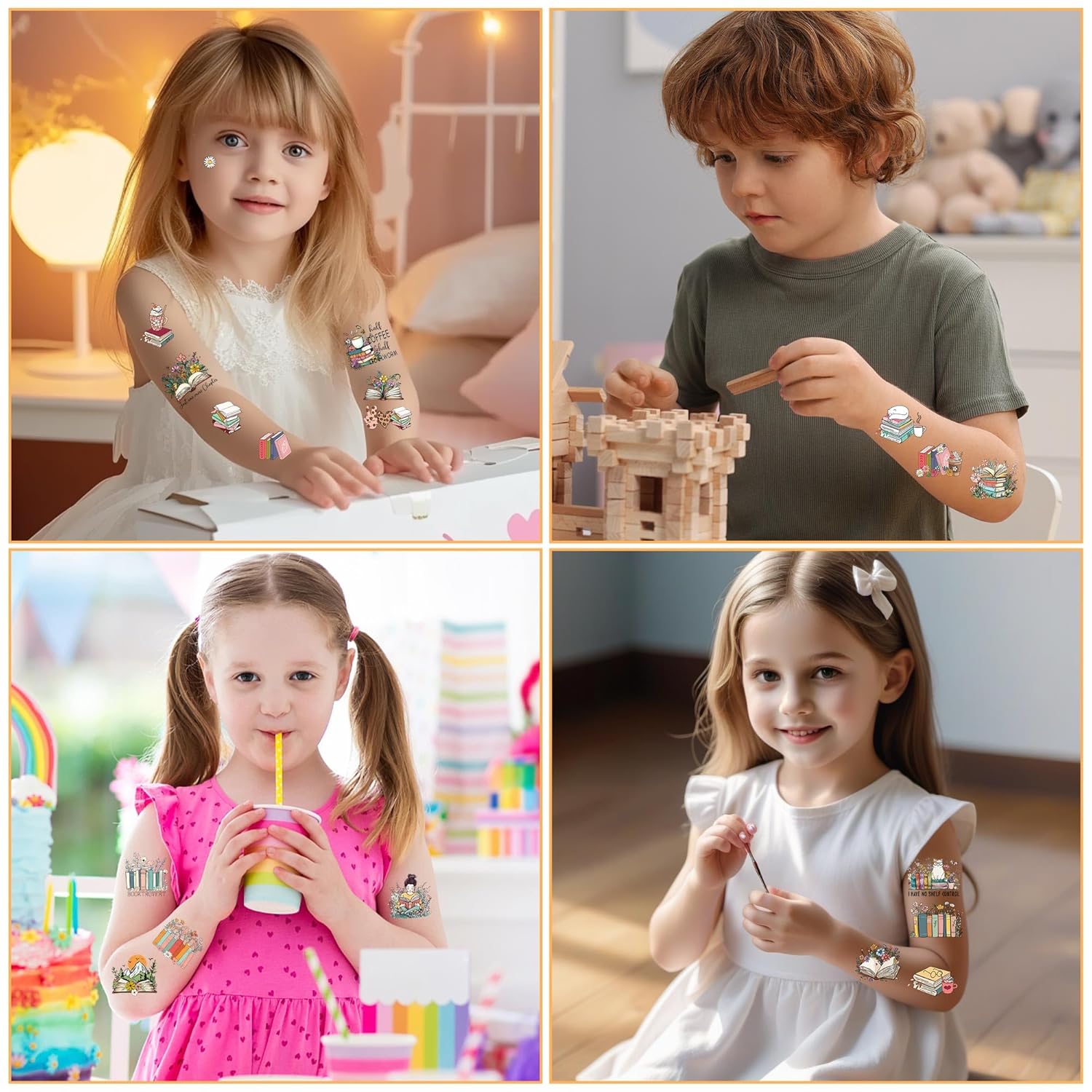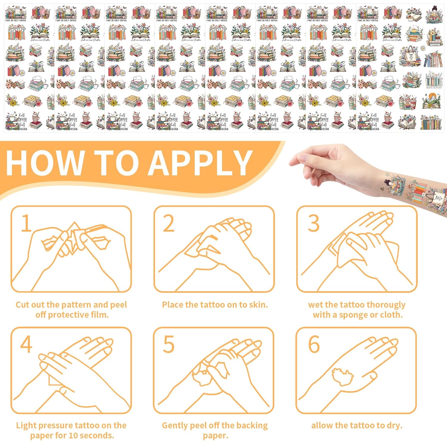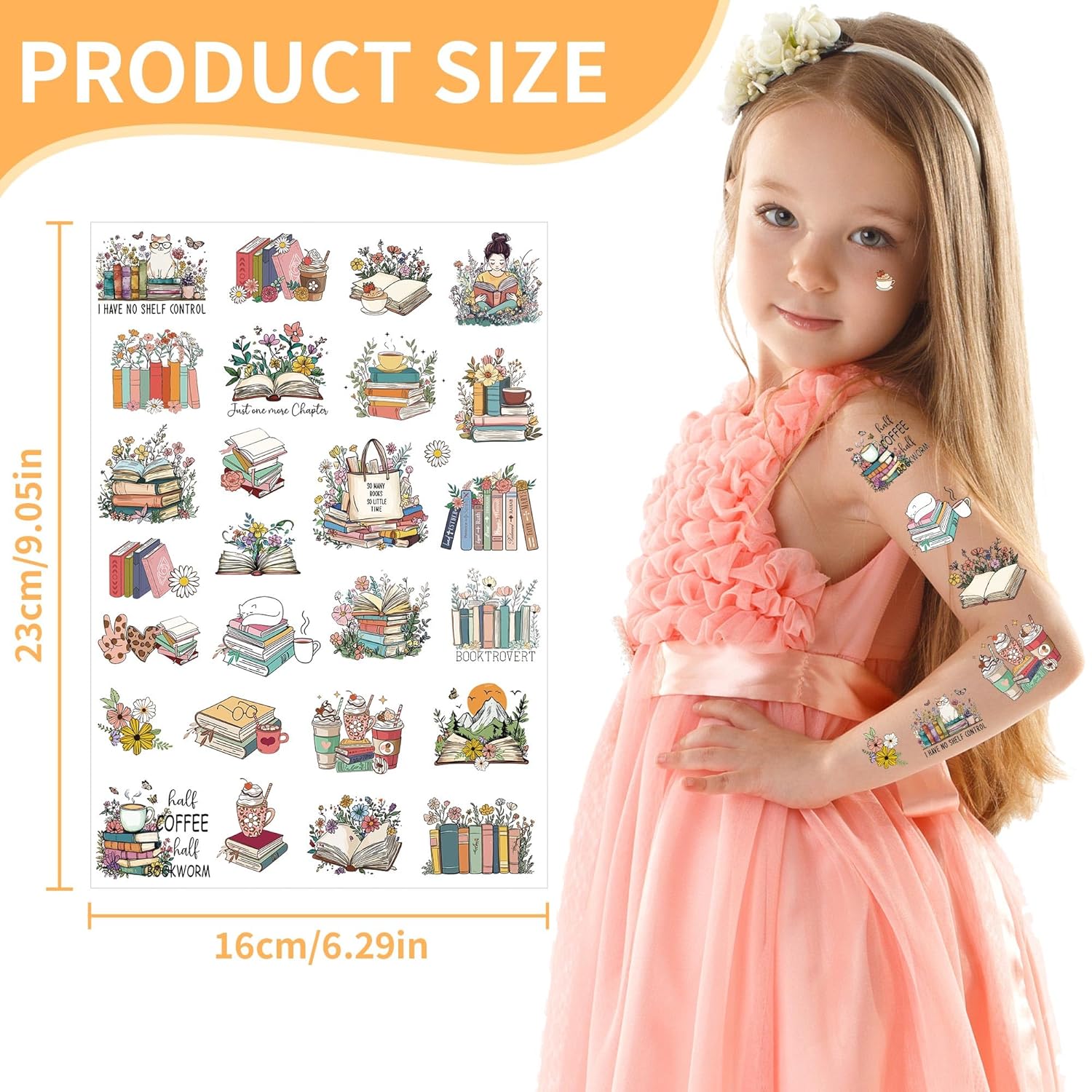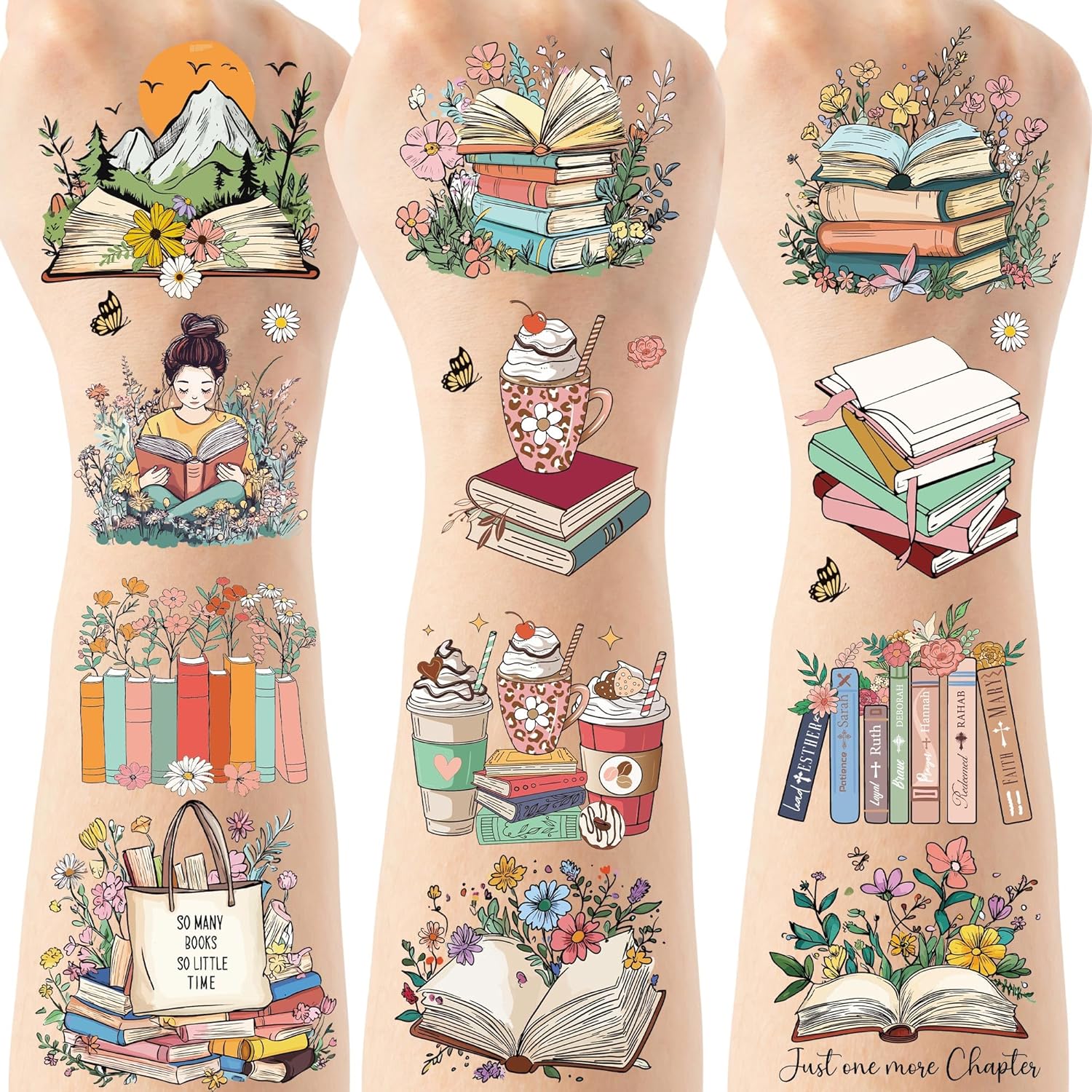 Cozy Reading-Themed Tattoo Set: This 8-piece set features a charming blend of bookish imagery, blooming books, sleepy cats, steaming coffee mugs, and tranquil mountain sunsets, great for celebrating the joy of quiet moments and a good read