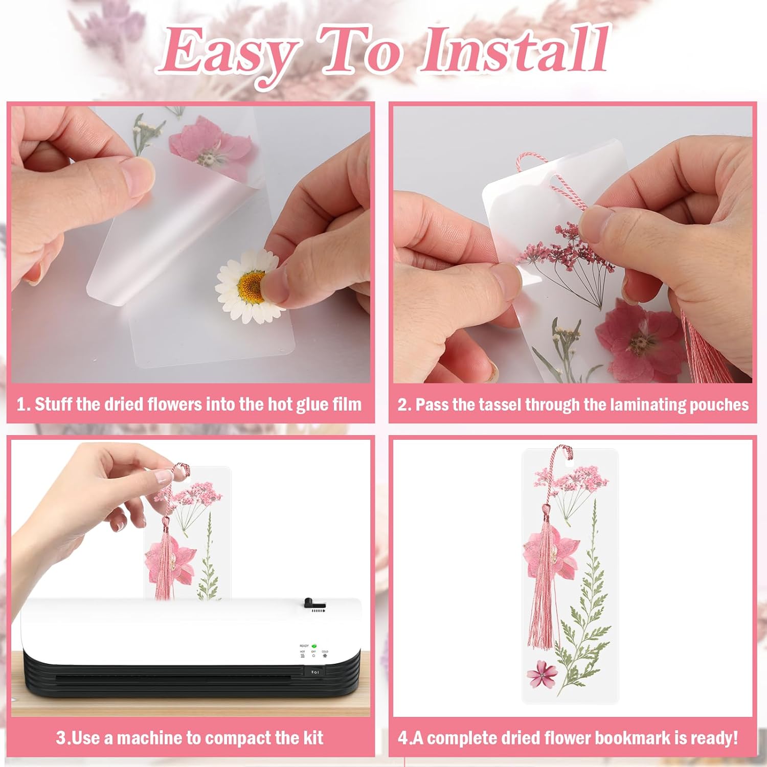 Size:Laminating Pouches 6.3*2.4 Inch/Tassels 5.1 Inch/Dried Flower Set 4.1*5.7 Inch