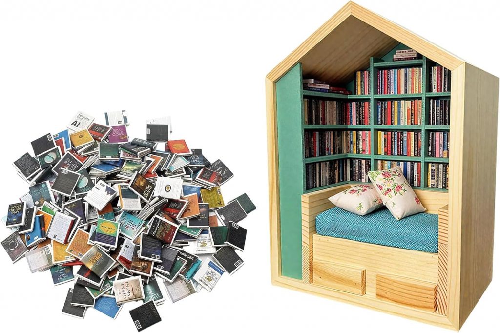 This green anxiety bookshelf set comes with 300 mini brands books. It serves as both